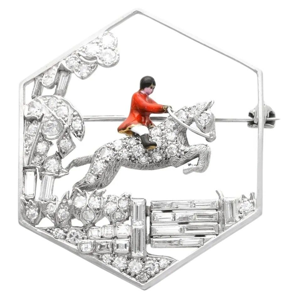 С викторианской эпохи и до начала XX века конный спорт, которым увлекались высшие слои общества, был увековечен в ювелирных изделиях с бриллиантами и эмалью. Броши с изображением лошади и жокея отражают энтузиазм того времени по отношению к скачкам, таким как те, что проводились в Аскоте в Англии. Броши с изображением лошади и охотника, подобные этой, возможно, носили в роскошных охотничьих домиках, где собирались группы после поездки.