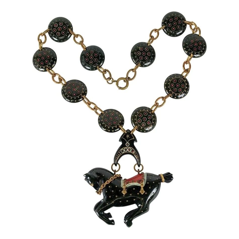 Во время Великой депрессии дизайнеры начали создавать украшения из бакелита, первого в мире синтетического термореактивного пластика. Изделия обычно имели игривые мотивы, включая фрукты, цветы и животных. Это ожерелье с карусельной лошадкой из темно-зеленого бакелита, выпущенное примерно в 1930 году, отличается редкими деталями, включая эмалевые вставки и латунные поводья.