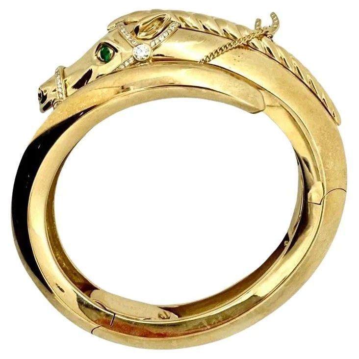 Пантера — неофициальный талисман Cartier, но французская ювелирная фирма на протяжении многих лет включала в свои коллекции множество других животных, в том числе птиц, слонов и жирафов. В 1970-х годах в коллекцию даже вошли несколько лошадей. У лошади на этом браслете из полированного золота с двойным шарниром скульптурная голова и грива, цепочка-уздечка, бриллиантовые детали и изумрудные глаза.