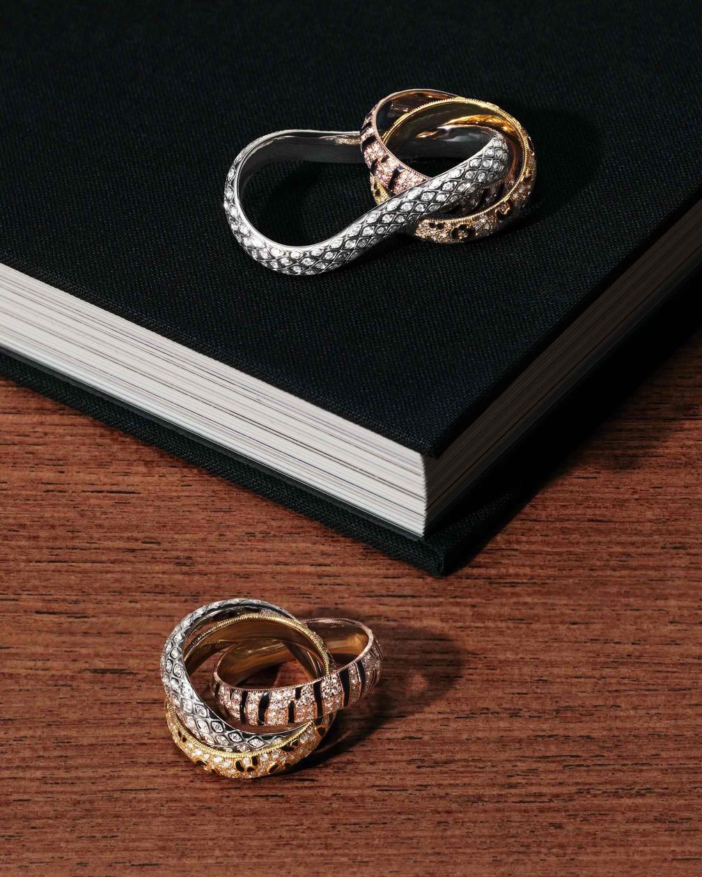 Если обратить внимание на первую категорию, то никто не удивится, увидев пятна со шкуры пантеры, украшающие одну из трех полос Trinity в новых кольцах (одно из которых предназначено для ношения на двух пальцах), браслетах и одной серьге.