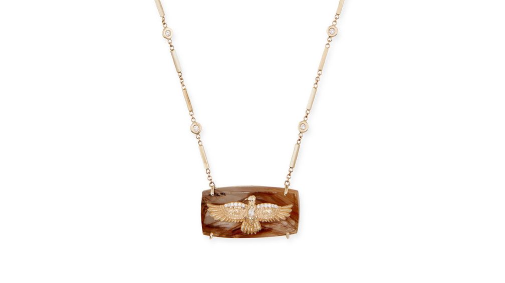 Это ожерелье из коллекции Thunderbird Slab сочетает в себе мотив птицы-громовержца из 14-каратного желтого золота с бриллиантами и пластину из рутилового кварца: