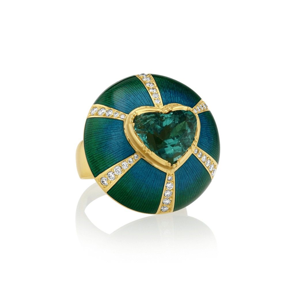 Тщательно проработанные текстуры добавляют глубины ее дизайнам. Точно нанесенная эмаль придает ее работам еще большую глубину и формирует изысканную рамку для драгоценных камней, занимающих центральное место.