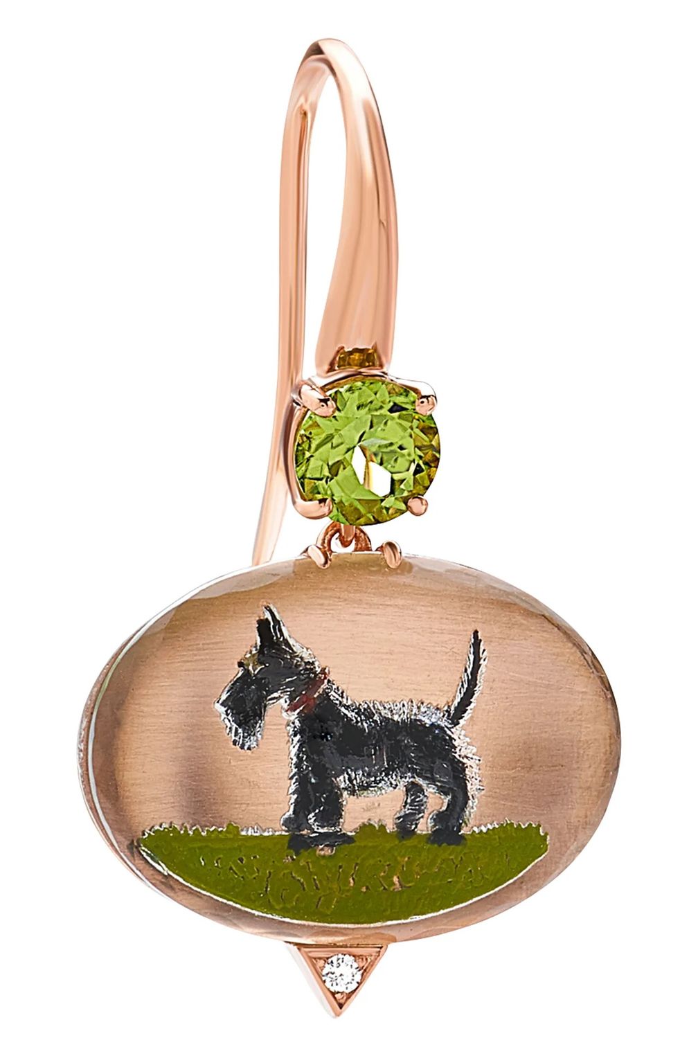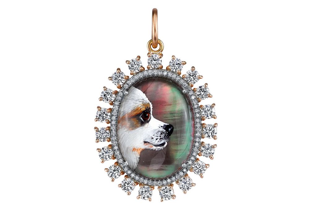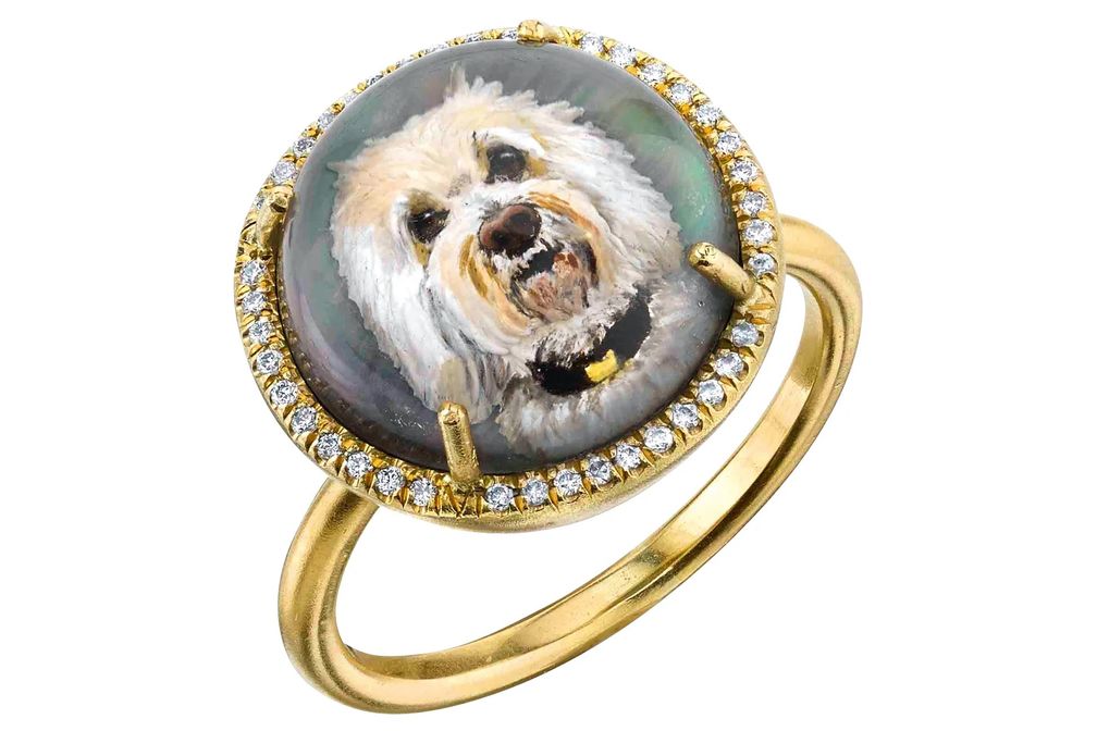 Файн Хьюз добилась успеха, создавая повествовательные дизайны, включающие небольшие, похожие на татуировки мотивы, которые она сначала рисует акварелью, а затем отдает мастеру-эмальеру, чтобы тот украсил ими кольца, кулоны и многое другое. И Джекс не первый домашний питомец, которого она запечатлела. Были и лошади, и кошки, и еще больше собак, включая «прекрасного дога в миниатюре, сидящего на выгравированном полумесяце и рядом с плавающим красным яблоком – его любимой закуской, украденной с дерева в его саду».