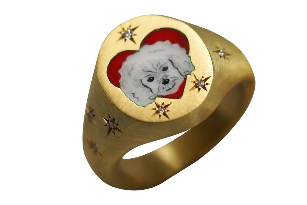 Особые знаки привязанности, обрамленные в ювелирные украшения, миниатюрные портреты не представляют собой ничего особенного. Более примечательно то сходство, которое Сиси Файн Хьюз недавно создала в своей лондонской студии. В качестве натурщика выступила домашняя собака, чьи средневековые предки были любимцами французских королевских дворов. А очаровательный маленький бишон-фризе, который теперь красуется в центре кольца из желтого золота Cece Jewellery, – это Джекс, верный спутник одной из клиенток марки. «Джекс – одна из ее самых больших любовей, – объясняет Файн Хьюз, – поэтому мы с командой выбрали восхитительное большое красное сердце, чтобы обрамить его пушистую мордочку, и, конечно, россыпь бриллиантов, чтобы он сверкал».