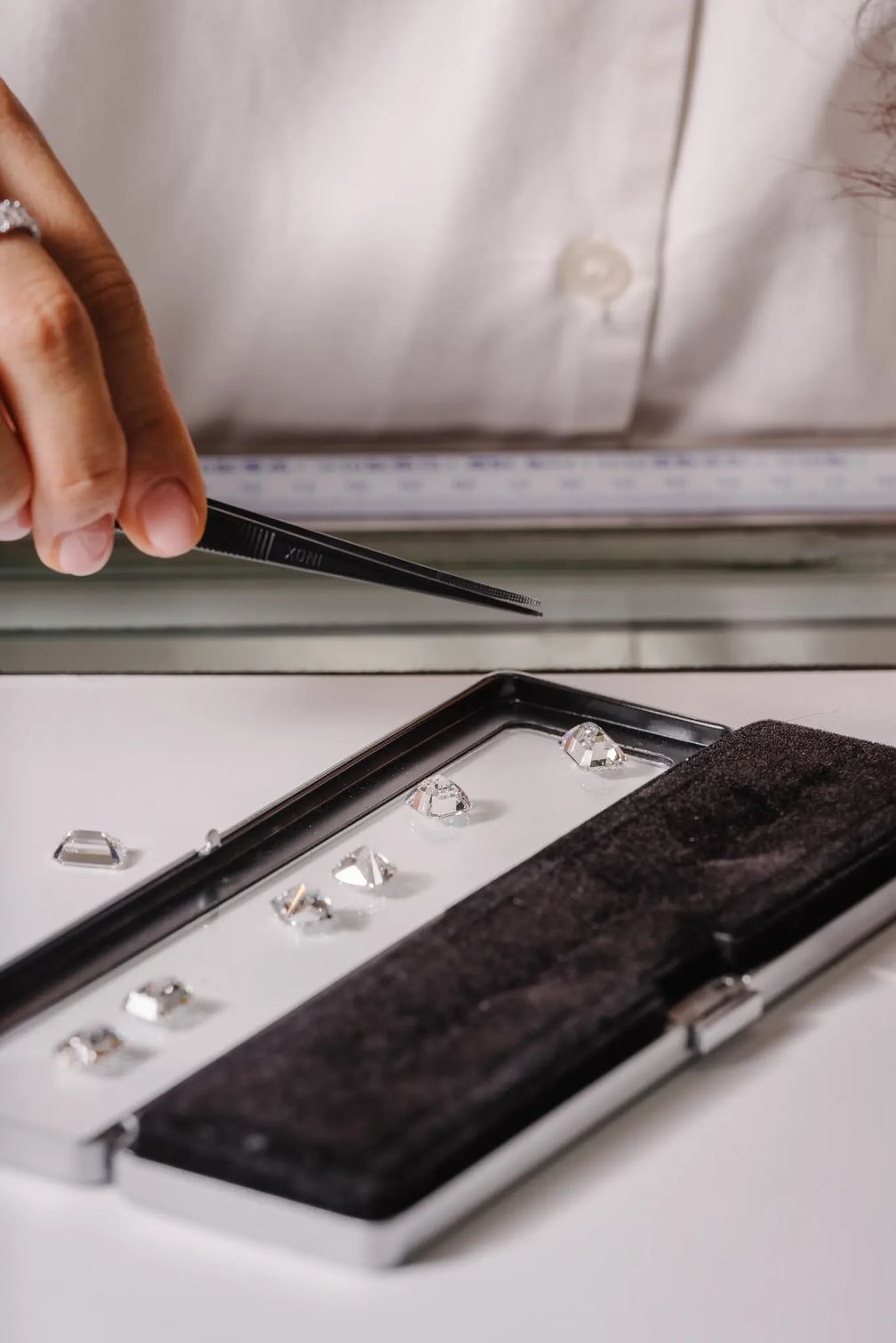 Чой Гай-Ин осматривает лабораторные алмазы в Чонно. Она научилась оптовой торговле алмазами от своей матери и в аспирантуре (Jun Michael Park for The New York Times):