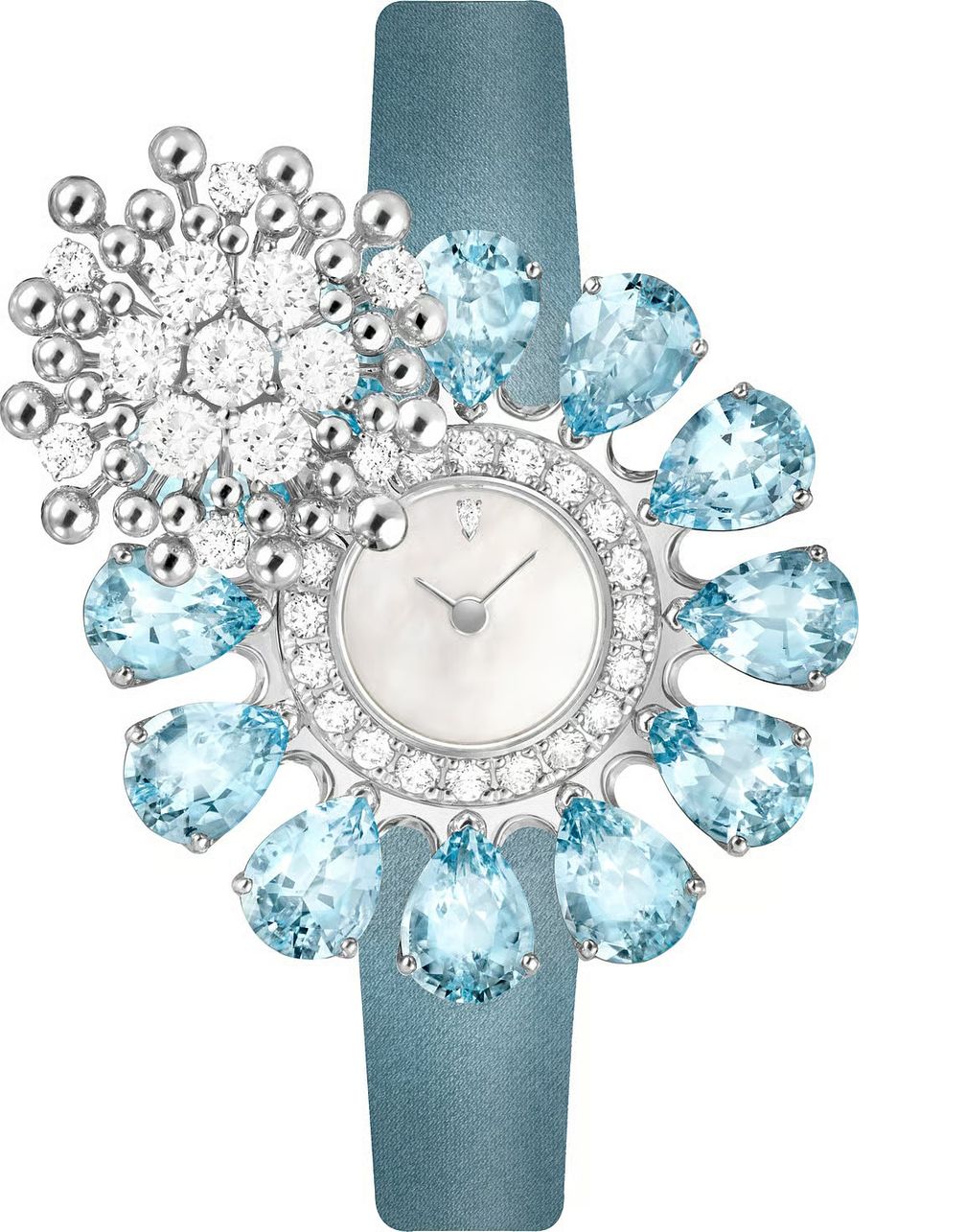Одним из главных экспонатов являются часы с секретом из белого золота, аквамарина, перламутра и бриллиантов, которые превращаются в брошь или колье, демонстрируя мастерство Дома в области функциональной красоты.
