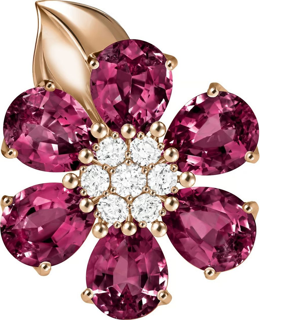 Эти драгоценные камни насыщенных оттенков, ограненные в форме лепестков, окружают алмазные пестики, создавая образ сада в полном цвету – достойное посвящение саду с розами в Дамфрис-хаус, который теперь официально переименован в Розовый сад Van Cleef & Arpels в знак признания постоянной поддержки модного Дома The King’s Foundation.