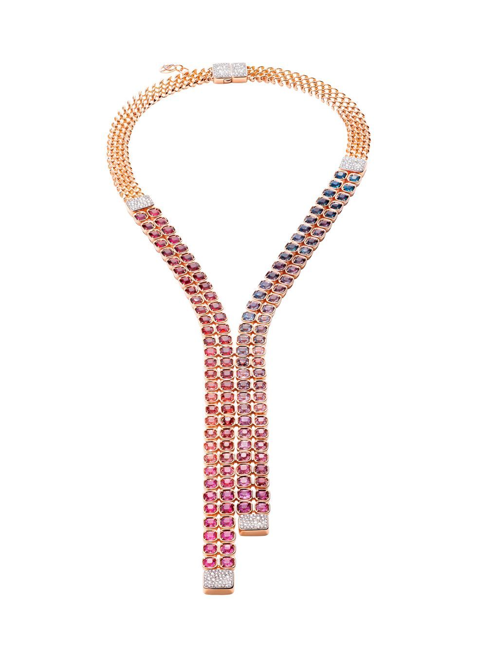 Ожерелье Skyline, напоминающее небрежно накинутый на шею шарф, создано из 128 редких шпинелей – камней, известных своим местом в истории (рубин Черного принца в британской Императорской государственной короне? Вопрос с подвохом. Это шпинель) и своей редкостью (высококачественные шпинели найти сложнее, чем бриллианты). Это колье входит в линию под названием Vertical Landscapes, посвященную архитектуре города.