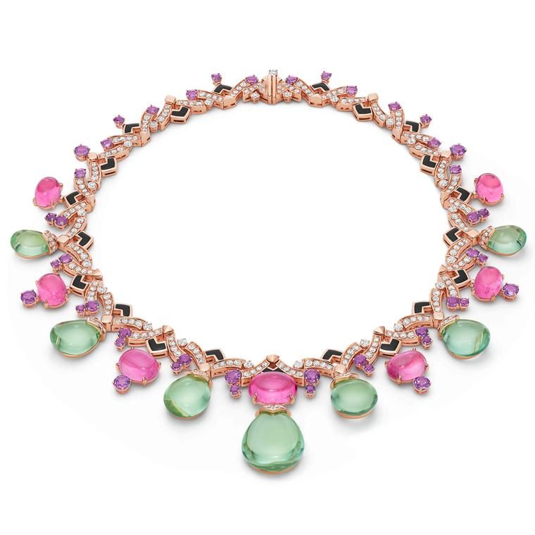 Колье Neon Chromatique украшено семью зелеными турмалинами (весом 108,75 карата), которые контрастируют с семью розовыми турмалинами, черными ониксами и темно-пурпурными аметистами (Bvlgari Color Journey 2025):