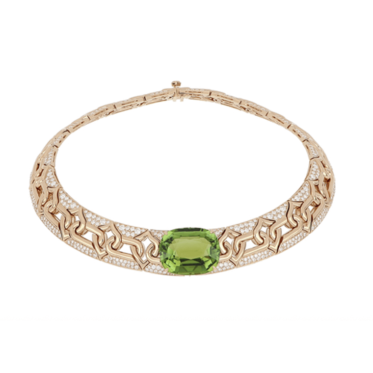 Зеленый турмалин огранки кушон, весом 42,96 карата занимает центральное место в ожерелье Verdant Harmony, дизайн которого вдохновлен наследием Дома и отсылает к римскому происхождению бренда и богатой истории города (Bvlgari Color Journey 2025):