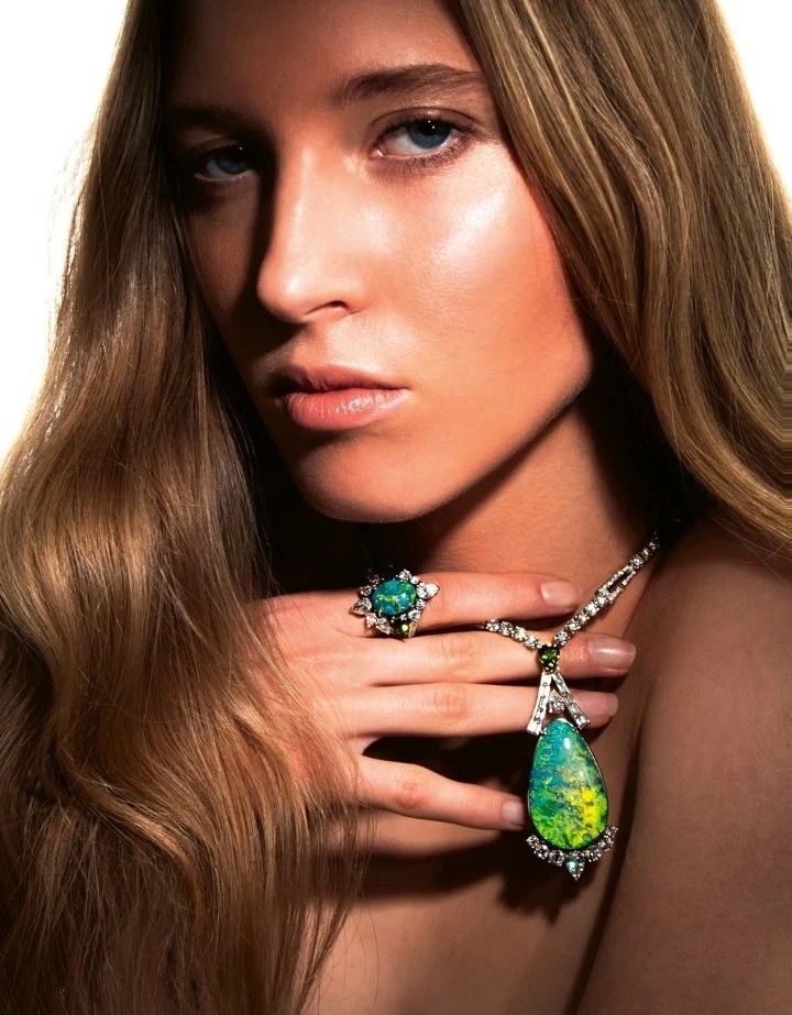 Колье Labirinti Gucci от Gucci из белого золота с опалами, турмалином параиба и бриллиантами. Модель: Кьяра @elitemanagement. Макияж: Dior Beauty: