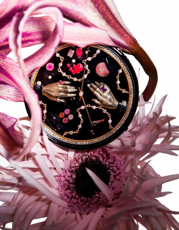 Часы Chanel Mademoiselle Privé Pincushion «Beauty Art». Корпус из титана с черным покрытием, задняя крышка из желтого золота 18 карат. Черный стальной безель с покрытием, украшенный 84 розовыми сапфирами багетной огранки (7,50 карат). Черный лакированный циферблат со скульптурными стрелками из 18-каратного желтого золота. Основные средства макияжа выполнены из 18-каратного золота с черным покрытием и эмалью. Руки украшены двумя культивированными половинчатыми жемчужинами и двумя розовыми сапфирами. Миниатюрные ожерелья из 18-каратного желтого золота с десятью бриллиантами круглой огранки и 14 жемчужинами. Композиция окружена 120 бриллиантами круглой огранки и 234 миниатюрными жемчужинами из 18-каратного желтого золота. Произведено Les Cadraniers de Genève, собственность F.P.Journe: