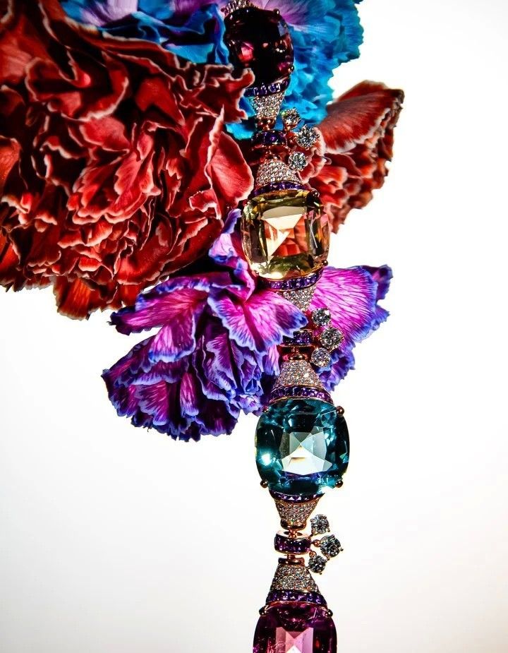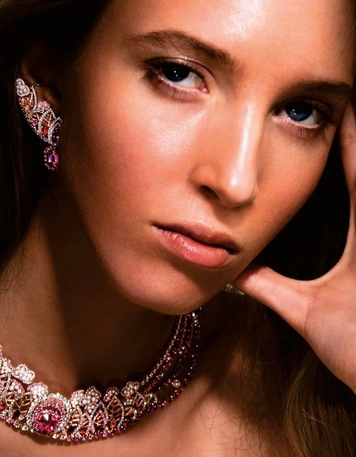 Колье Dior Milly Dentelle Roseraie от Dior Joaillerie из розового золота с бриллиантами, розовыми шпинелями, рубинами, белым культивированным жемчугом, желтыми сапфирами, шпинелями, розовыми сапфирами и мандариновыми гранатами. Серьги Dior Milly Dentelle Roseraie из розового золота с бриллиантами, розовыми шпинелями, мандариновыми гранатами, желтыми сапфирами, белым культивированным жемчугом и розовыми рубинами. Модель: Кьяра @Elitemanagement:
