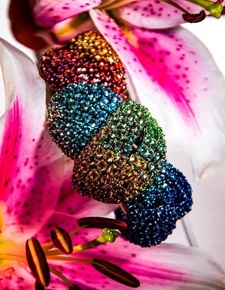 Браслет от Piaget из титана с более чем 600 сапфирами, гранатами и турмалинами, установленными в титановых безелях в тон. Уникальное изделие: