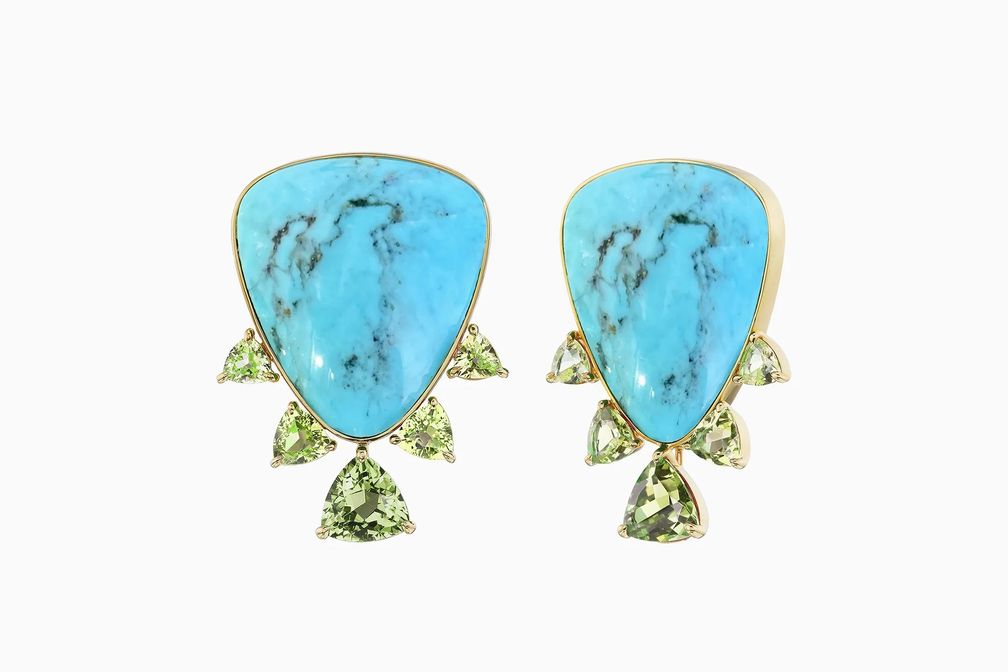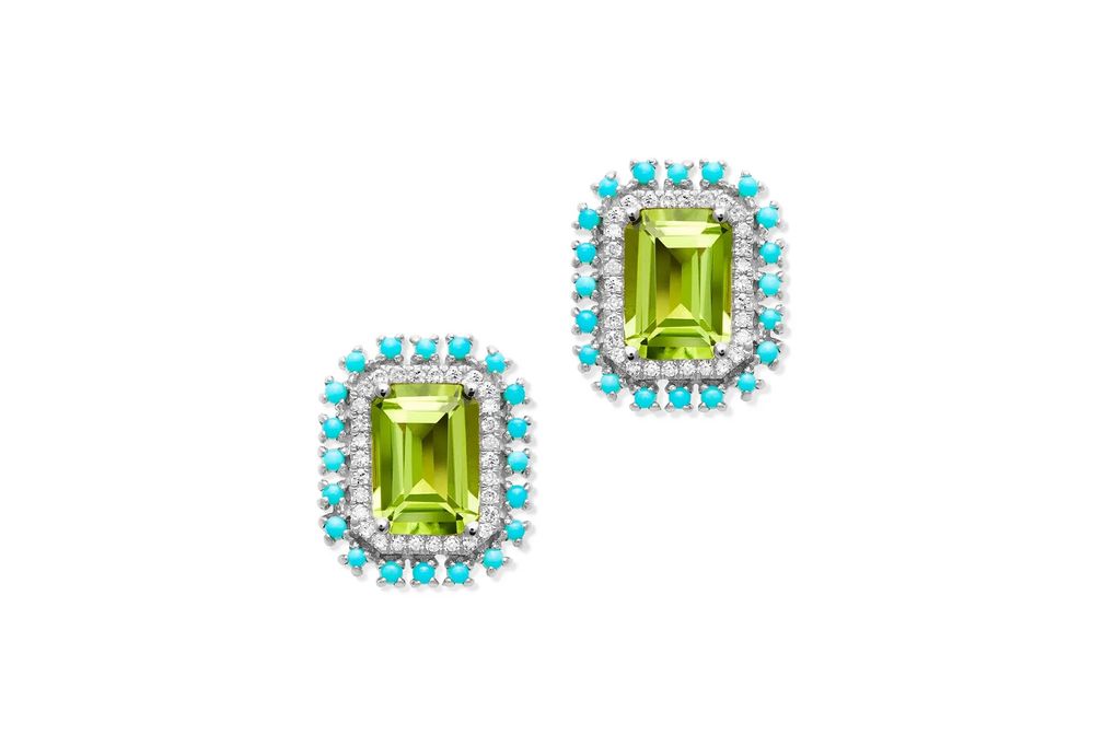 Серьги-гвоздики Monaco из 14-каратного белого золота с бриллиантами, хризолитом и бирюзой: