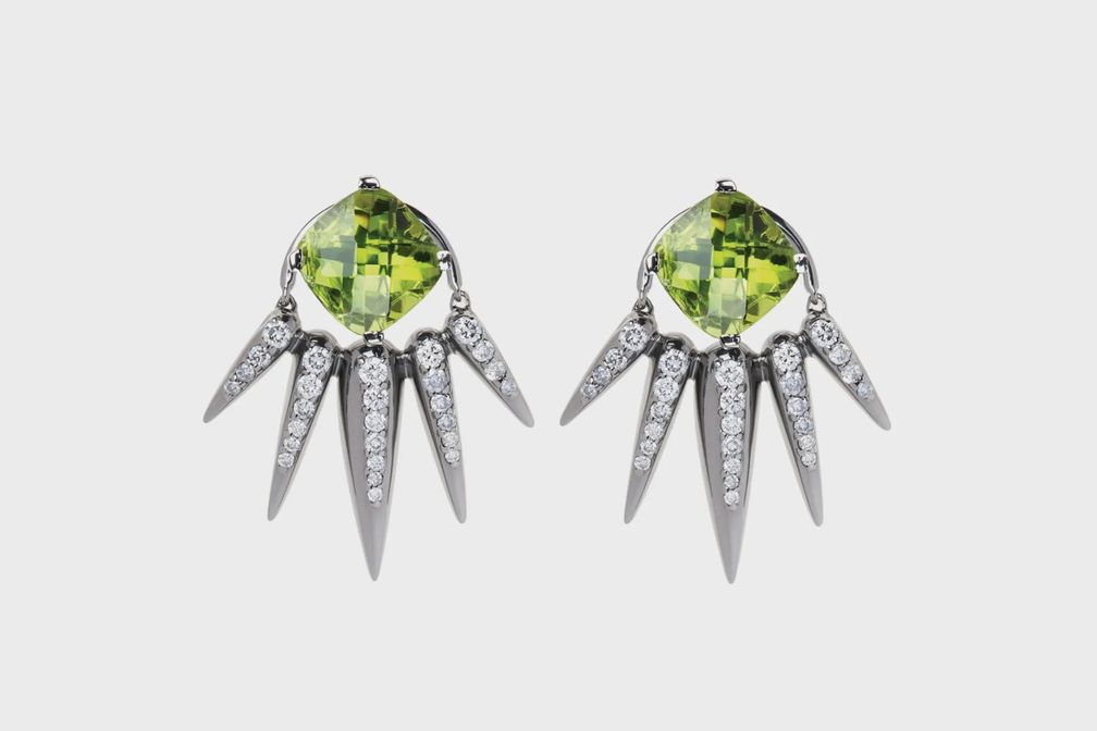 Серьги из черного золота с белыми бриллиантами и хризолитом: