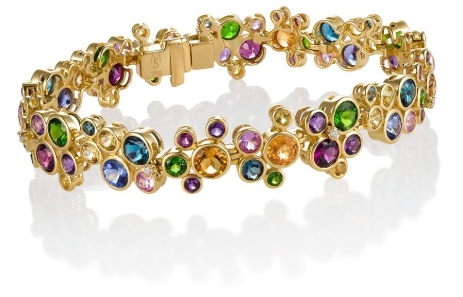 Золотой браслет Milky Way от Martha Seely украшен голубым топазом, цитрином, розовым и зеленым турмалином, аметистом, иолитом, спессартином, желтыми сапфирами, розовыми гранатами и бриллиантами: