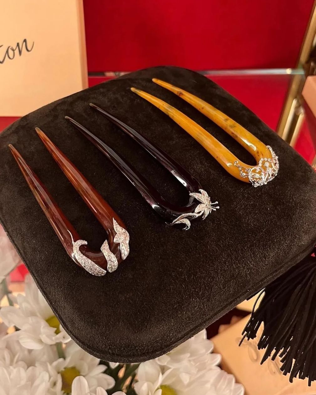 По ее словам, выбор материала для каждой заколки для волос также имел решающее значение. Для изготовления оправы с бриллиантами требовался изысканный, но прочный металл, который можно было бы аккуратно обработать, в то время как для самой заколки требовались пружинистость и упругость. «Слишком мягкая – она гнется, слишком хрупкая – она ломается. И то, и другое должно сочетаться. Главное – отделка. Нижняя сторона должна быть гладкой, края – смягченными, а оправа – незаметной. Если украшение для волос зацепилось или тянет, значит, оно не получилось. Также важен баланс: слишком тяжелая прическа будет скользить, в то время как хорошо подобранная заколка должна растворяться в прическе и просто блестеть».