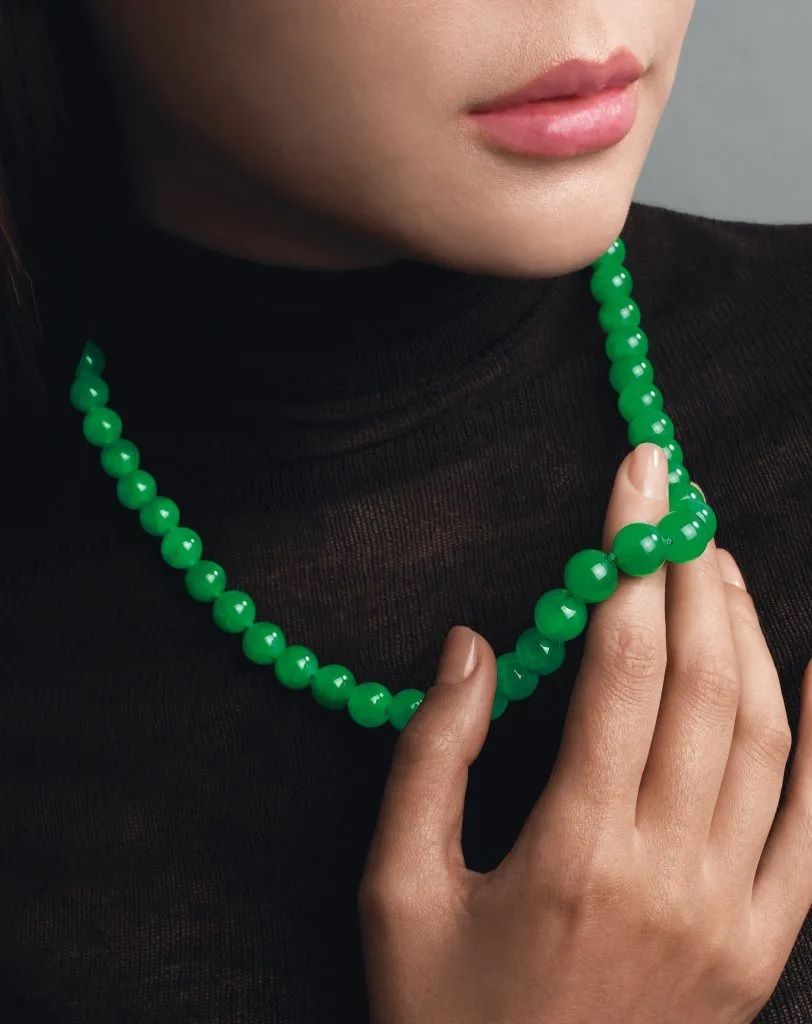 Ожерелья из жадеитовых бусин являются наиболее коллекционными, объясняет Гика, добавляя, что ценность «определяется цветом и оттенком, а затем прозрачностью». Еще одна причина, по которой они так популярны, заключается в том, что эти бусины «должны быть вырезаны из цельного камня», чтобы они имели «одинаковые цвет и текстуру».