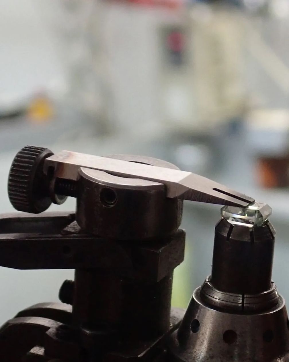 На этих фотографиях виден бриллиант, крепко удерживаемый в устройстве для тщательного осмотра в процессе полировки. Готовый бриллиант весом 1,42 карата – результат медленной и тщательной полировки без чрезмерного нагрева.