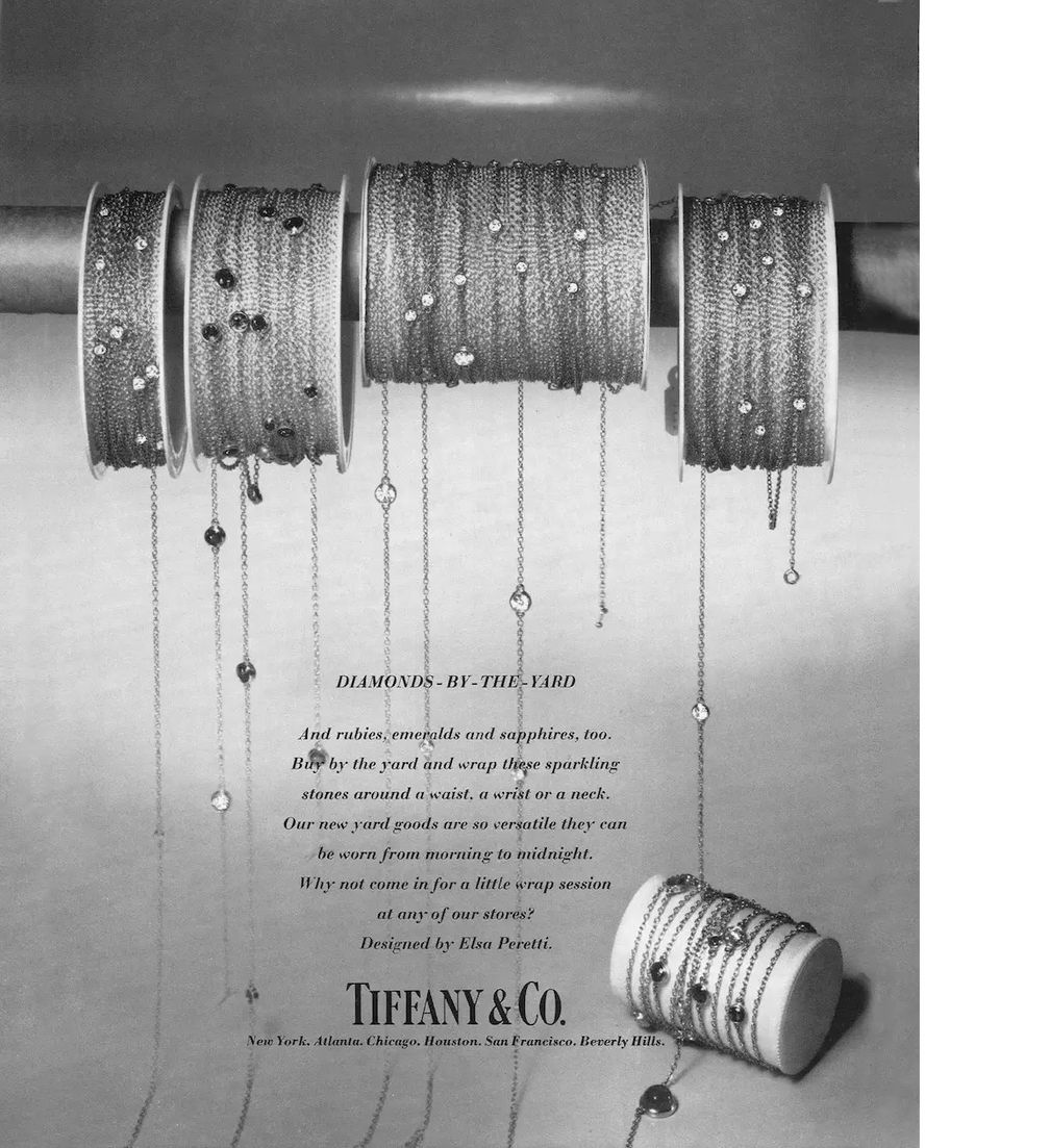 Для своего первого дизайна Tiffany в 1974 году Перетти разместила 12 маленьких бриллиантов в золотых ободках разной длины на 36-дюймовой цепочке. Перед ней стояла задача создать упрощенное бриллиантовое украшение, доступное для женщин, имеющих ограниченный бюджет.