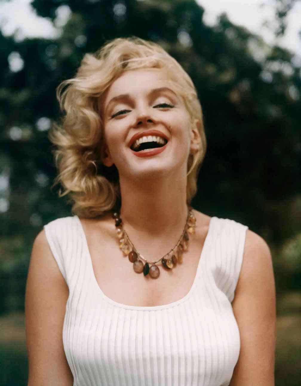 Монро надела ожерелье из янтарных бусин. «Это редкий снимок, на котором она носит украшения. Обычно она просто позволяет своей красоте говорить самой за себя», – сказала куратор музея (Sam Shaw/Shaw Family Archives):