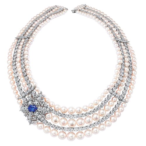 Ожерелье из жемчуга Акойя и бриллиантов с акцентом в виде морской звезды, в центре которого голубая шпинель весом 2 карата (Tiffany & Co.):