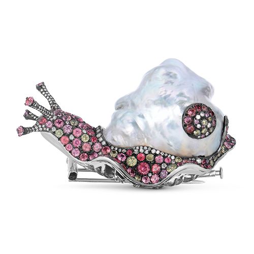 Брошь с жемчужиной, шпинелями, гранатами и бриллиантами из 18-каратного белого золота (Cicada):