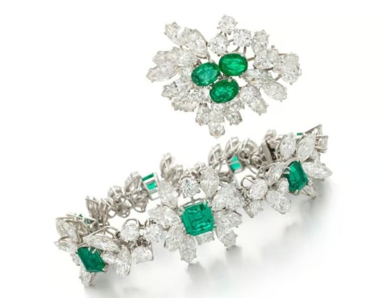 Украшение с градуированным цветочным узором, колумбийскими и замбийскими изумрудами ступенчатой огранки, а также бриллиантами классической огранки, ушло с молотка за 88 900 евро (94 151 доллар США). Его можно носить как браслет, колье или брошь.