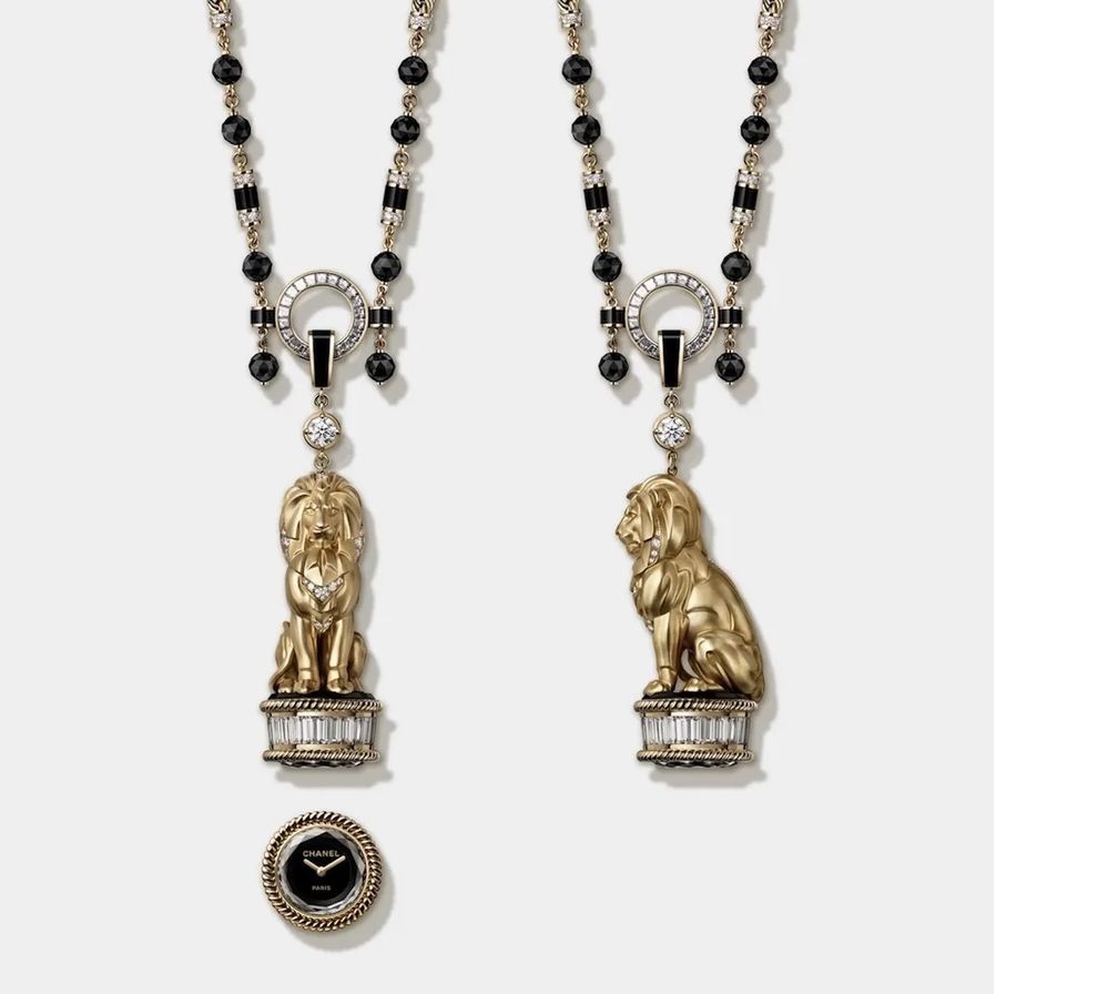 Колье Seated Lion из 18-каратного желтого золота, оникса и бриллиантов с черным лакированным циферблатом: