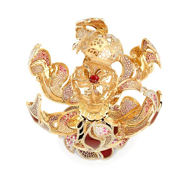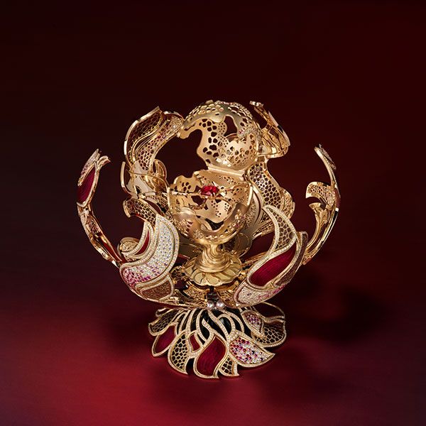 Чтобы подчеркнуть огненный оттенок рубинов, бренд Fabergé объединил их с 4 312 белыми бриллиантами круглой огранки, 252 коричневыми бриллиантами круглой огранки, 421 розовым сапфиром круглой огранки и 61 аметистом, говорится в заявлении бренда. Все камни оправлены в 18-каратное розовое золото, чтобы дополнить красные и розовые оттенки изделия.
