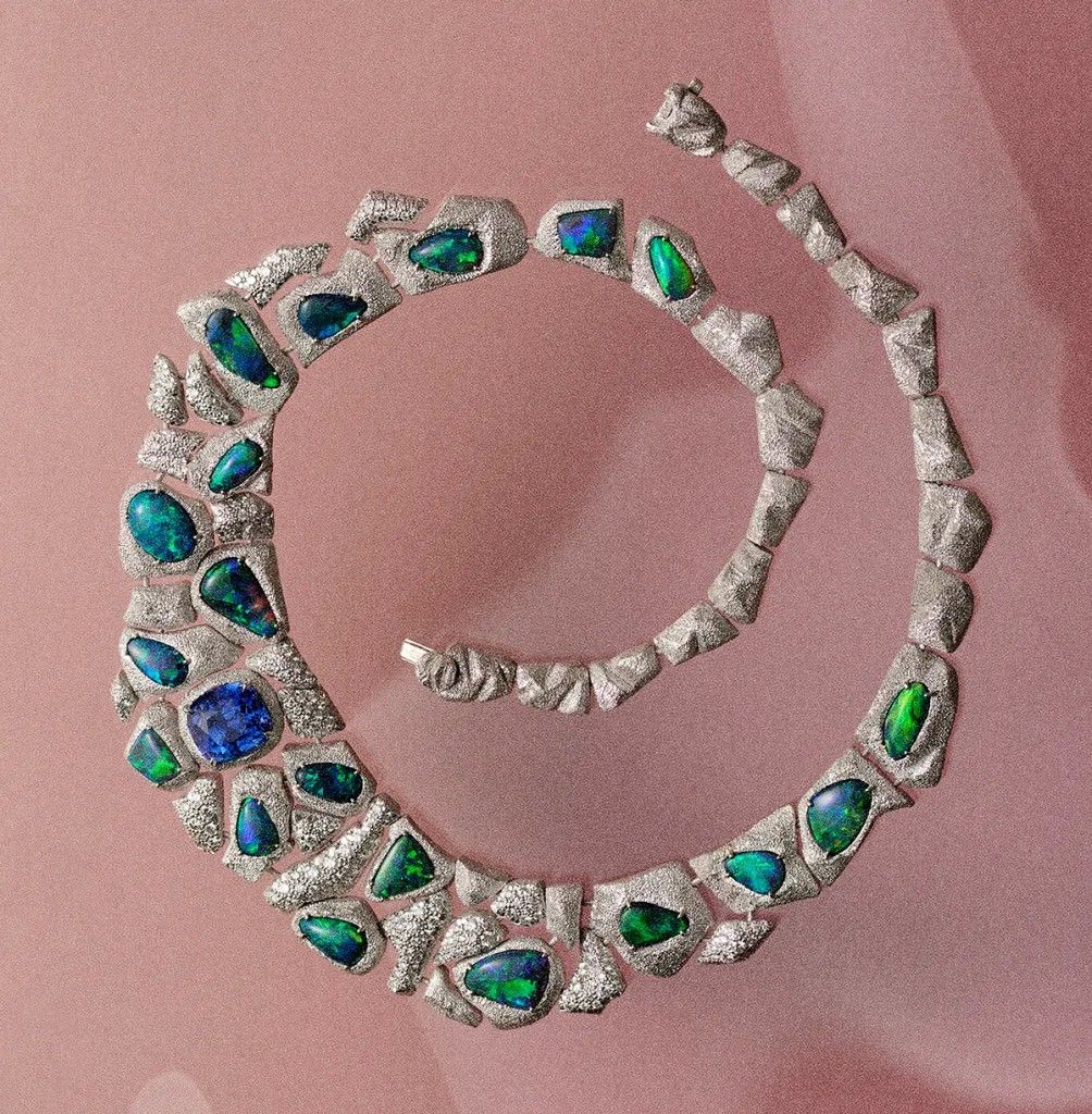 Колье Extraleganza из коллекции Flowing Curves от Piaget из 18-каратного белого золота с мадагаскарским сапфиром 9,26 карата, австралийскими опалами 26,39 карата и бриллиантами: