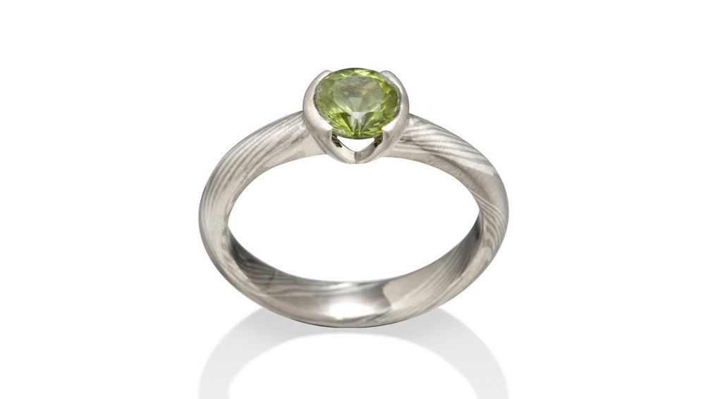 Кольцо Mia от Chris Ploof из смеси металлов, выкованных вручную в технике мокуме гане, с перидотом: