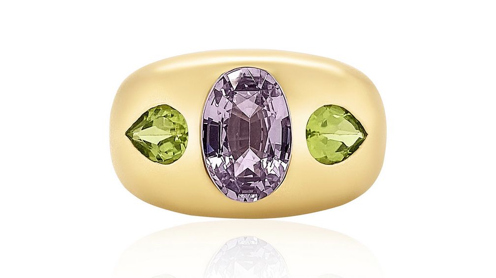 Кольцо от Claudia Mae из 14-каратного желтого золота с лавандовой шпинелью и грушевидными перидотами: