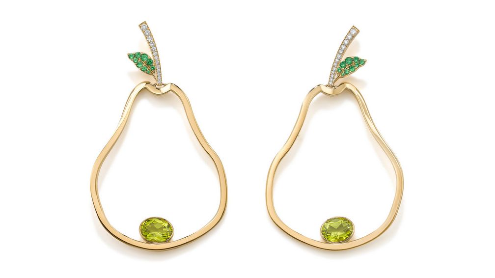 Серьги Fruits of Love Pear от Robinson Pelham из 14-каратного желтого золота с перидотами, бриллиантами и цаворитами: