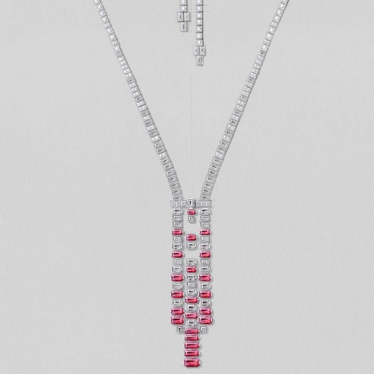 Колье Euphonia сразу же выделилось на общем фоне. Редкий набор рубинов огранки изумруд сочетается с бриллиантами огранки изумруд, расположенными чередующимися вертикальными нитями, которые ниспадают в строгом геометрическом порядке. Ажурная конструкция сохраняет легкость композиции, несмотря на концентрацию камней, а повторяющаяся огранка создает четкий визуальный ритм. Это очень характерный для Cartier способ использования цвета: точный, архитектурный и бескомпромиссный.