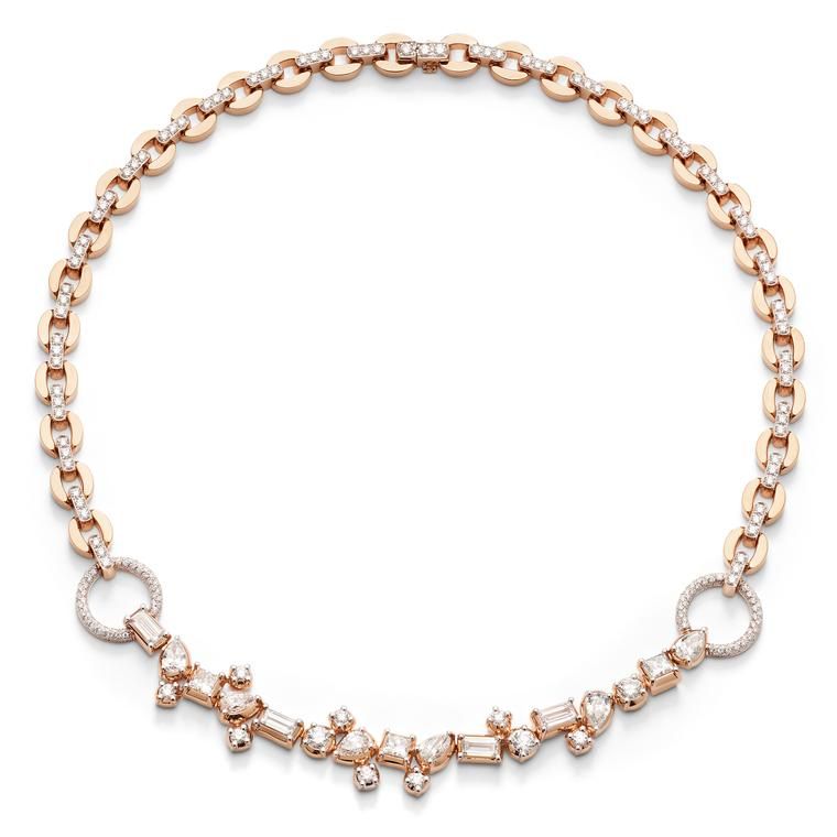 Парюра переосмысливает круглую цепочку Pomellato 1970-х годов из розового золота, украшенную бриллиантами огранок грушевидная, принцесса и багет. Контраст между округлыми линиями цепочки и четкой конфигурацией камней создает геометрический ритм.