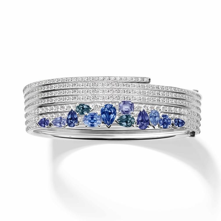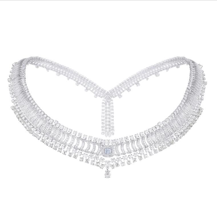 В центре внимания – колье с редким 31-каратным необработанным сапфиром огранки изумруд. Белые бриллианты огранки изумруд образуют сплошную светящуюся поверхность, от которой расходятся бриллианты и сапфиры грушевидной формы, создавая глубину и сияние по всему колье. Серьги в тон дополняют эту геометрию сочлененными каскадами сапфиров огранки изумруд.