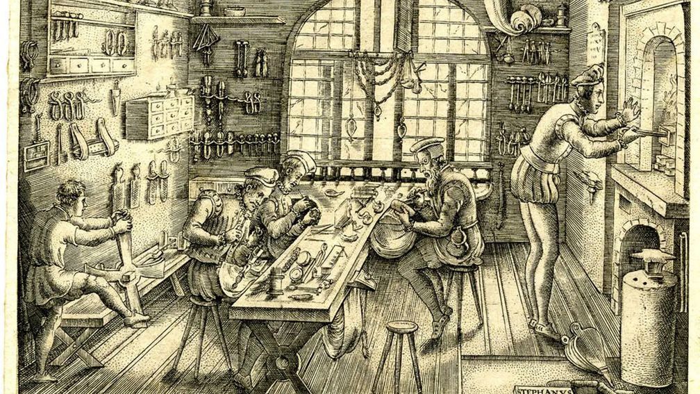 Гравюра Этьена Делона, изображающая мастерскую ювелира, 1576 год (© The Trustees of the British Museum):
