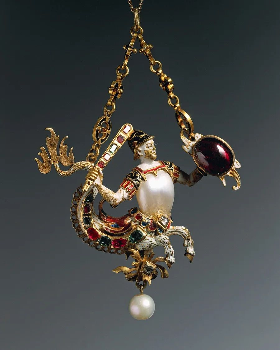 Золотая подвеска с эмалью, украшенная жемчугом, бриллиантами, гранатами и рубинами, изображающая тритона, 1580-1590 гг. (DEA / A. DAGLI ORTI/De Agostini via Getty Images):