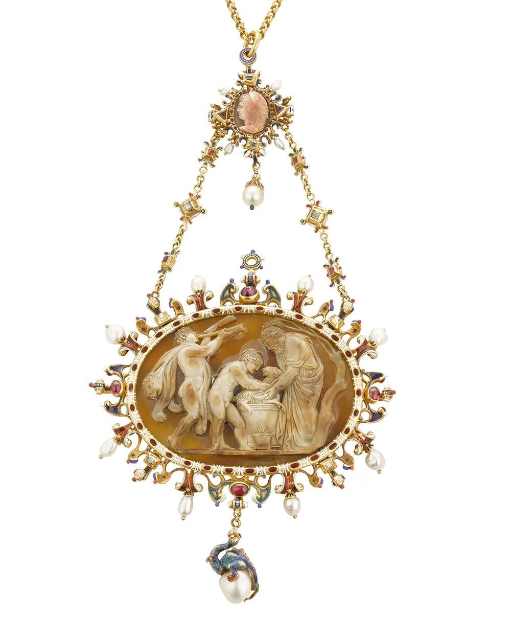 Золотая подвеска-камея эпохи Возрождения с эмалью, бриллиантами, жемчугом, рубинами и другими драгоценными камнями: