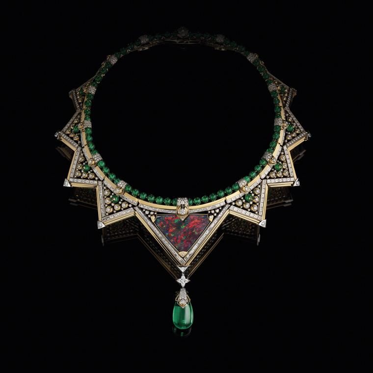 Как и культовые сундуки Vuitton, этот драгоценный камень является хранителем секретов, повторяя традиционные мотивы Дома с помощью таких деталей, как графическое использование буквы V и бриллиантов, имитирующих гвозди на закругленных краях сундуков. Каплю из замбийского изумруда весом 28 карат можно снять и носить как подвеску на цепочке, а ряды бусин контрастируют с графичной треугольной конструкцией ожерелья.