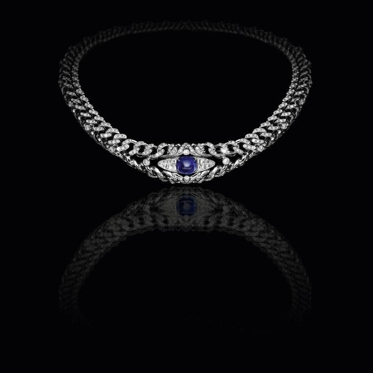 Мужская сила сочетается с женской мягкостью в линии украшений Keeper в стиле унисекс, дополненной технически совершенными золотыми элементами и плавным движением. Keeper богат древними символами и посланиями, такими как всевидящее око, выполненное из старинного синего сапфира из Шри-Ланки, огранки кабошон, весом 10,12 карата, окруженного бриллиантами в инкрустированном колье.