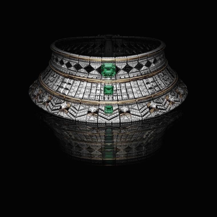 Maestria – это вершина технического совершенства, выраженная в семи драгоценностях, украшенных изысканной оправой из бриллиантов, сотканных подобно богатому полотну. Колье в виде высокого воротника украшено ослепительным узором из бриллиантов, расположенных рядами, словно мозаика из света, с тремя колумбийскими изумрудами, самый крупный из которых весит 8,88 карата.