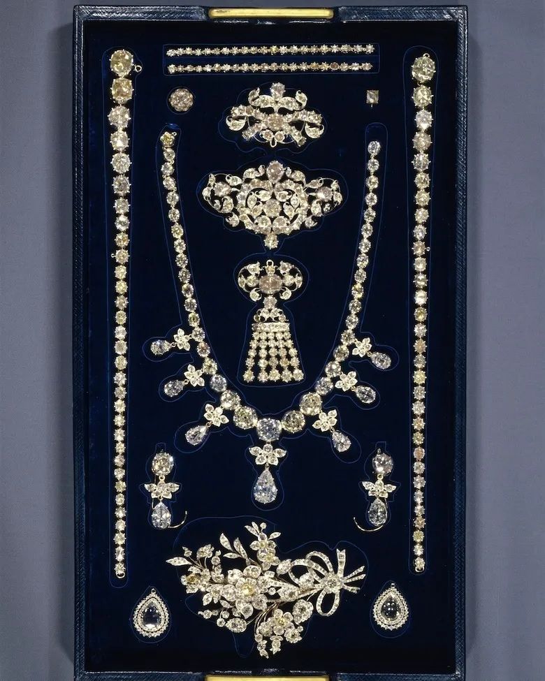 Эти бриллианты, ограненные в виде маленьких роз, прекрасно переливаются на свету, что делает их еще более потрясающими. В 19 веке украшения этого сета были обновлены: из более старинных бриллиантов были изготовлены ожерелья, серьги и броши.