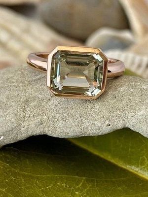 Празиолит обрамляют желтым золотом или серебром. Кристалл такого позитивного оттенка прекрасно смотрится в повседневных или вечерних серьгах или кольцах. Поскольку цвет самоцвета мягкий, не слишком яркий и насыщенный, лучше носить его сольно, не сочетая с другими цветными камнями.