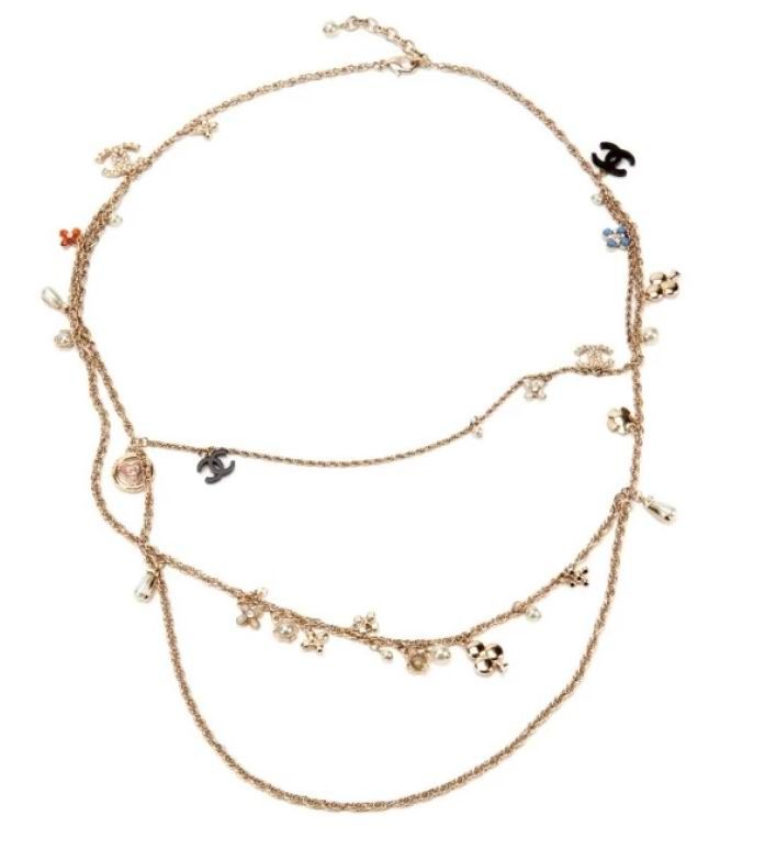 Ожерелье с шармами из разноцветного стекла, искусственного жемчуга, страз и бледно-золотистого металла от Chanel, 2019 год: