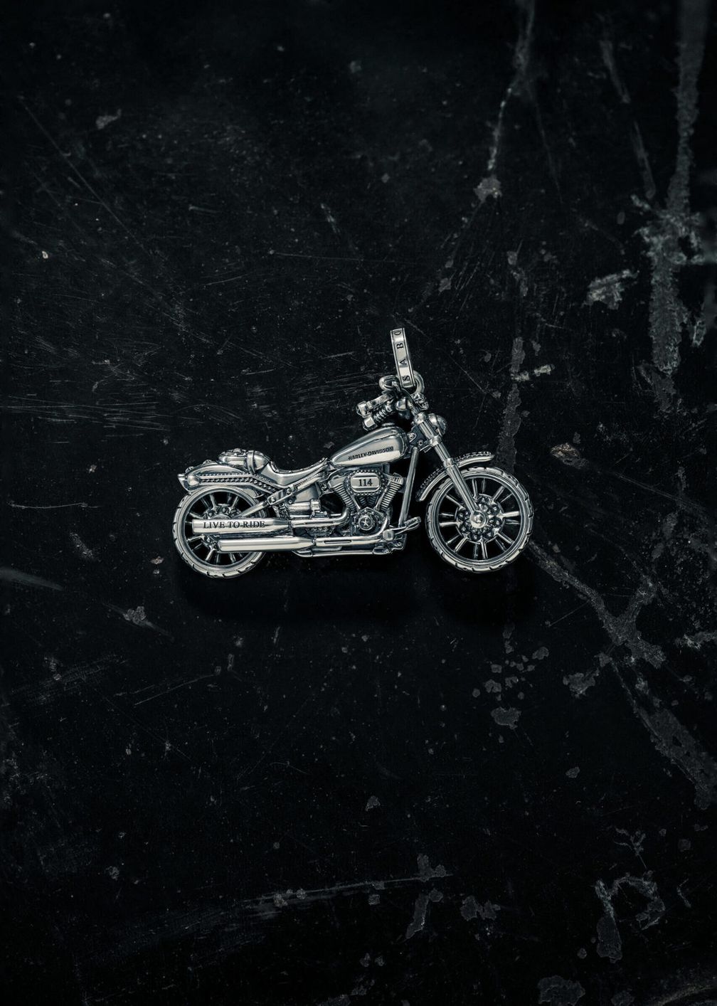 Особое украшение коллекции – подвеска Breakout 114. Она изображает, пожалуй, самый узнаваемый круизер Harley-Davidson, с его неповторимым силуэтом и широкой задней шиной. Подвеска, отделанная вручную вороненым серебром 925 пробы, имеет подвижные колеса, замысловатые граненые элементы и глубокую гравировку. Тщательная проработка дизайна придают изделию подлинную связь с настоящим мотоциклом.