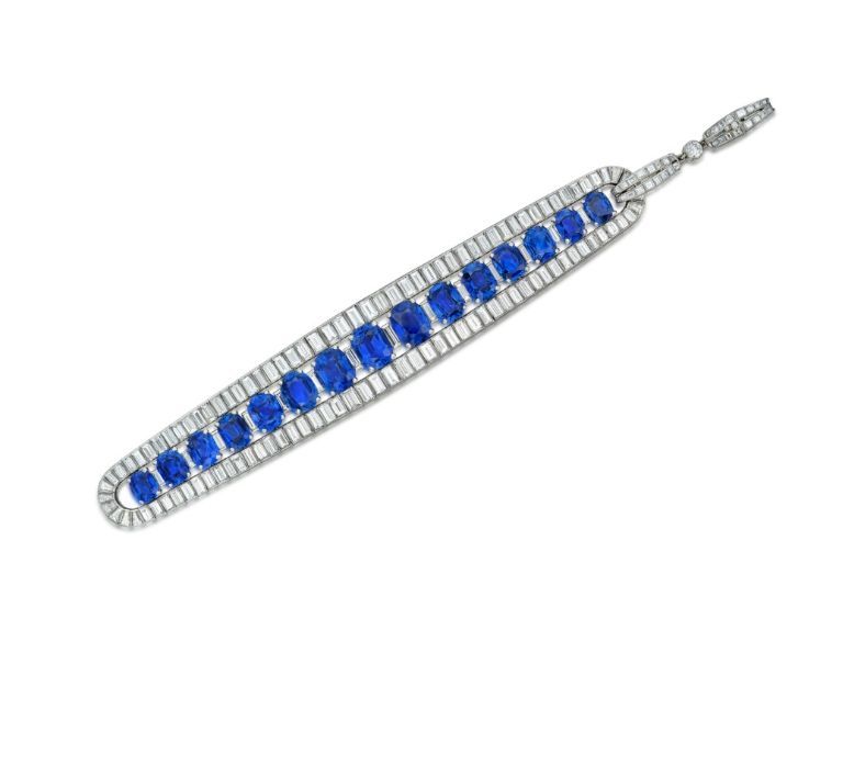 Браслет от Van Cleef & Arpels с бриллиантами огранки багет, огранки конический багет, квадратной и круглой огранок общим весом 27,54 карата и бирманских, кашмирских и цейлонских сапфиров общим весом 47,63 карата, как ожидается, будет продан на аукционе по цене от $ 1 млн до $ 1,5 млн.