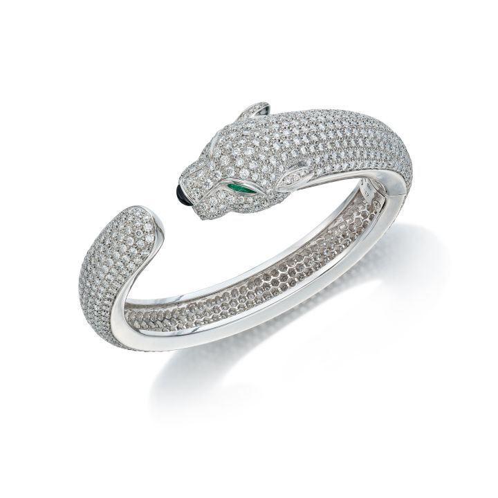 Браслет-манжета Panthère с бриллиантами, изумрудами и ониксом от Cartier также будет выставлен на продажу. Его стоимость составляет от $ 100 000 до $ 150 000.